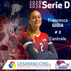 FRANCESCA GIOIA Num. di maglia 2 Età 24 Stagione 2024/2025 Squadra Cesarano Ciro Net Volley Posizione Centrale Tutte le Stagioni 2024/2025 2. FRANCESCA GIOIA3. ANITA ROSSO3. GIORGIA FANTONI4. GIORGIA MORICO4. ASIA CONTU5. SARA DI PIERRO6. GEMMA SCRIGNOLI7. ALESSIA PREVITI8. COSTANZA AGLIARDI9. GIULIA MANUGUERRA9. CECILIA PONS10. CAROLINA BERGNA11. NOOR ELHIFNAWY12. SARA VIGANO’13. FEDERICA NAPPO14. ELISA TURIELLO15. GIULIA MARZOTTO16. ILARIA RUBERTO17. ALESSANDRA GRUGNALE18. ELISA PANAROTTO