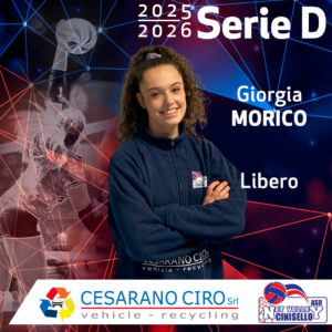 GIORGIA MORICO Num. di maglia 4 Età 20 Stagione 2024/2025 Squadra Cesarano Ciro Net Volley Posizione Libero Tutte le Stagioni 2024/2025 2. FRANCESCA GIOIA3. ANITA ROSSO3. GIORGIA FANTONI4. GIORGIA MORICO4. ASIA CONTU5. SARA DI PIERRO6. GEMMA SCRIGNOLI7. ALESSIA PREVITI8. COSTANZA AGLIARDI9. GIULIA MANUGUERRA9. CECILIA PONS10. CAROLINA BERGNA11. NOOR ELHIFNAWY12. SARA VIGANO’13. FEDERICA NAPPO14. ELISA TURIELLO15. GIULIA MARZOTTO16. ILARIA RUBERTO17. ALESSANDRA GRUGNALE18. ELISA PANAROTTO